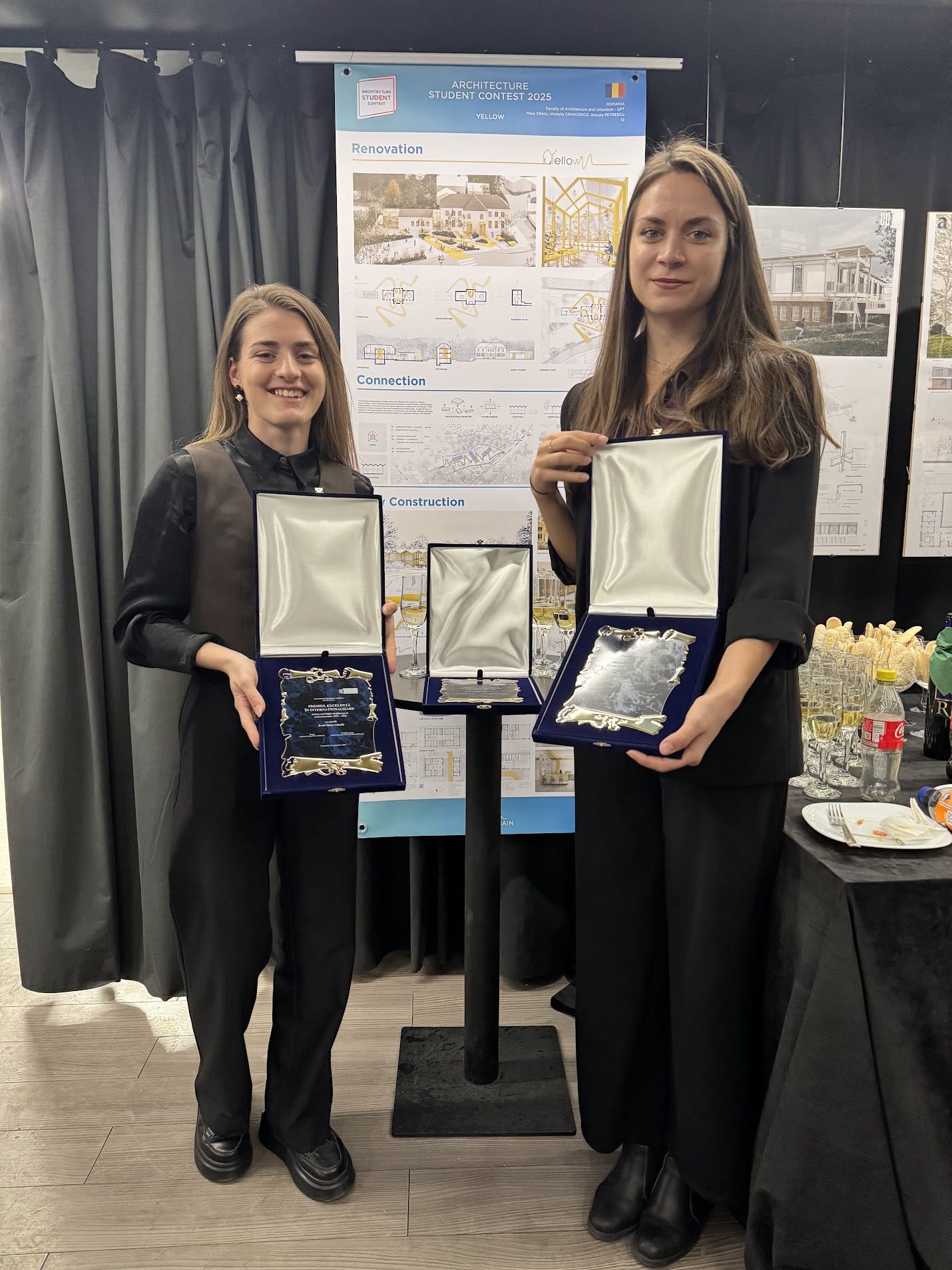 În cadrul Galei anuale a Premiilor de Excelență UPT, care a avut loc miercuri, 12 decembrie, studentele noastre Victoria Cravcenco, Mara Craiu și Ancuța Petrescu, câștigătoare la Concursul Studențesc Internațional organizat de compania Saint-Gobain – 2025, au fost recompensate cu Premiul de Excelență în Internaționalizare. Ele au obținut anul acesta, la ediția aniversară din Franța, Premiul Studentului, în urma acumulării celui mai mare număr de voturi din partea studenților câștigători ai etapelor naționale din cele 33 de țări participante la nivel global. Distincțiile au fost înmânate chiar de cadrul didactic coordonator, conf. univ. dr. arh. Cătălina Bocan, care le-a ghidat pe parcursul competiției. Cele trei au reușit, din trei locații diferite ale Europei (Timișoara, Padova și Sevilla – aflate în mobilități Erasmus+), să finalizeze cu succes proiectul „Yellow”, reprezentând cu excelență FAUT și UPT, marcând astfel prima victorie a României în acest concurs. Mulțumim tuturor celor implicați – cadre didactice și studenți – pentru efortul depus și felicităm încă o dată echipa!