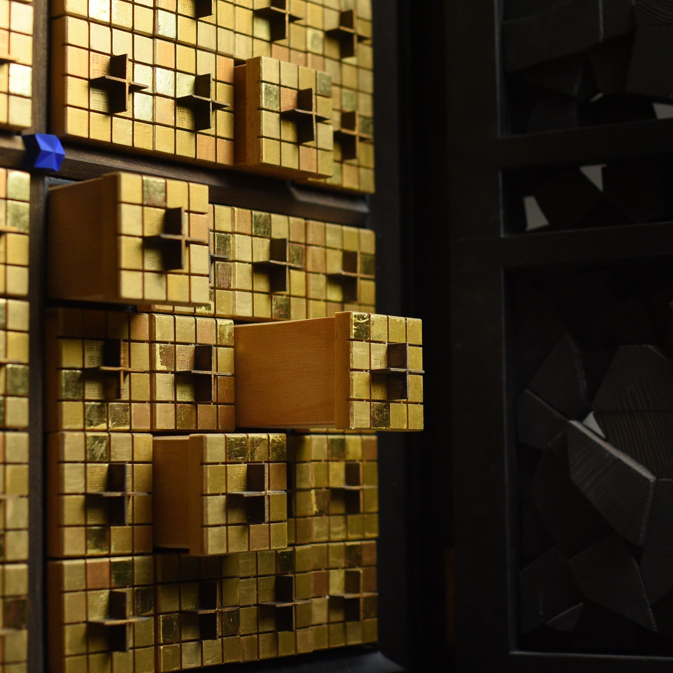 La deschiderea ușilor, se dezvăluie o compoziție aflată în antiteză cu exteriorul: o cruce centrală structurează spațiul în patru câmpuri aurii. Acestea devin fronturile a 64 de sertare, iar suprafața interioară, mult mai rafinată, este animată cromatic prin nuanțe variate de auriu — foiță, pulberi și reflexe luminoase — care creează un joc subtil de texturi. În centrul acestui peisaj radiant, o singură piesă în nuanță de albastru intens atrage privirea, conferind ansamblului o notă distinctă și evocatoare.