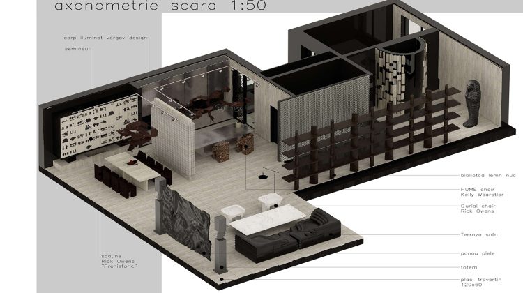 The project aims the design and furnishing of the day and night areas within a contemporary home with a permanent character, by adapting a pre-existing construction. The thematic conditions lead to a maximum configuration of the home, both in terms of space and budget. The home is intended for a personality from the real contemporary world, with activity in the artistic sphere in a broad sense. The solution involves understanding the profile and aspirations of the beneficiary, the design concept translating his plastic and stylistic preferences.