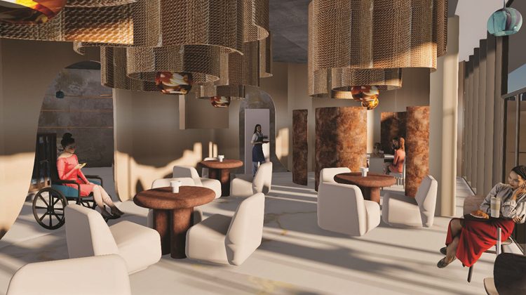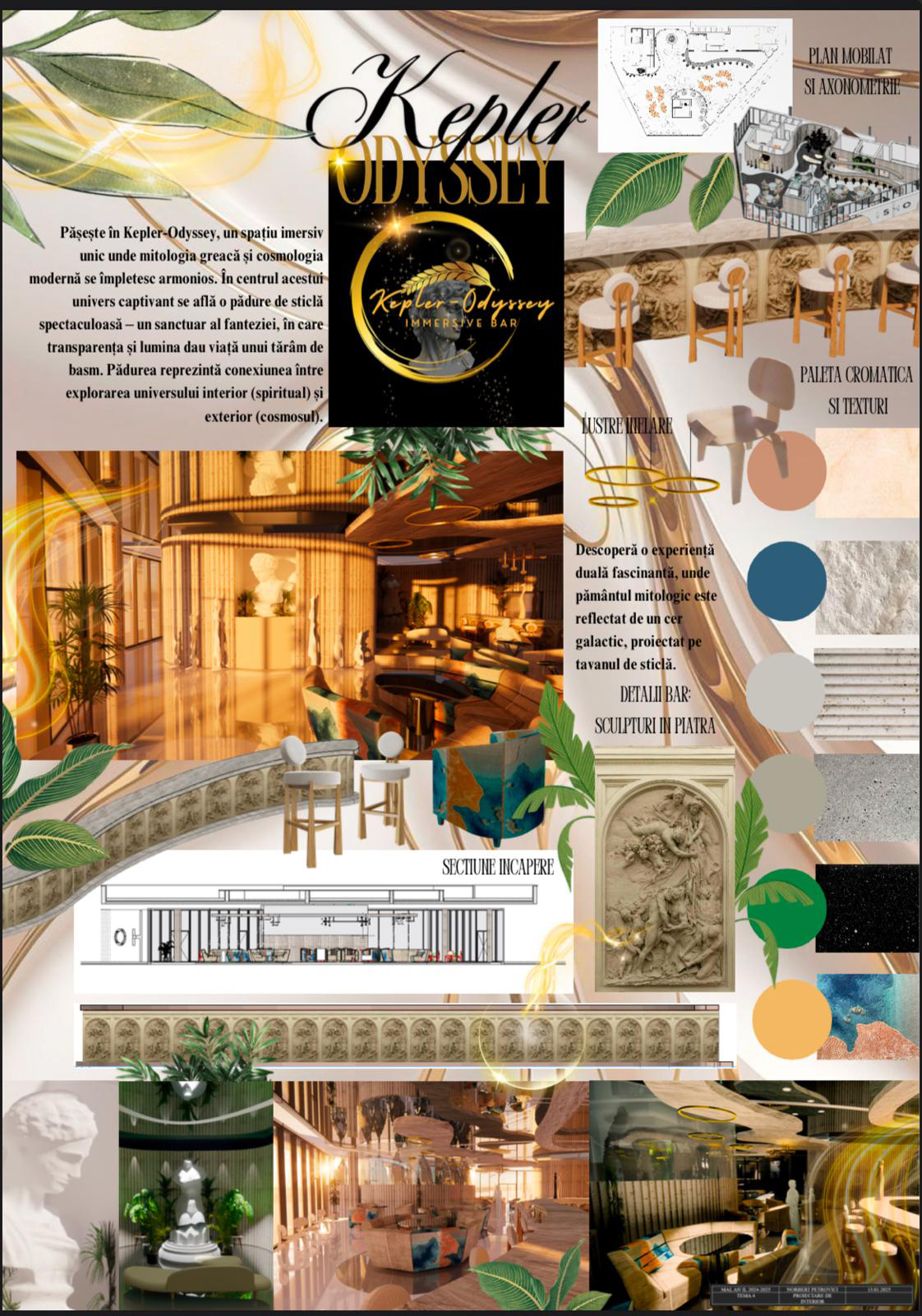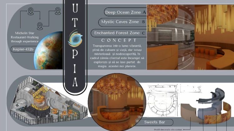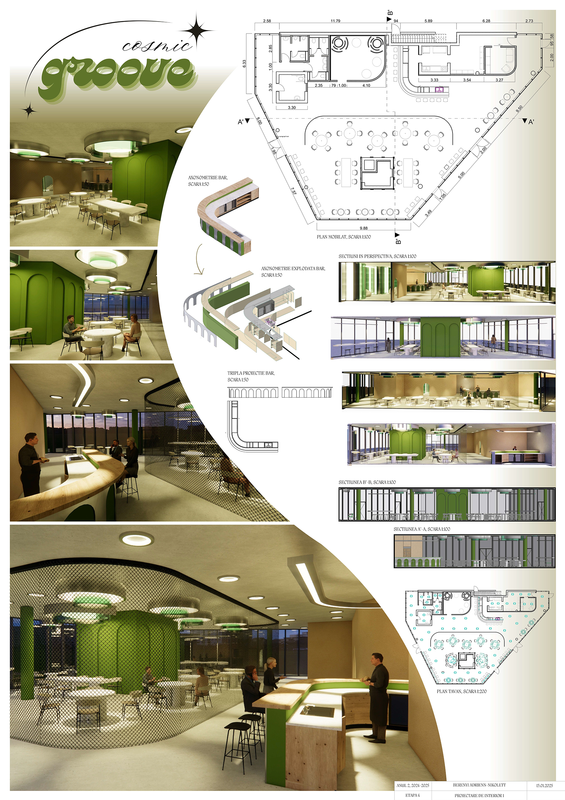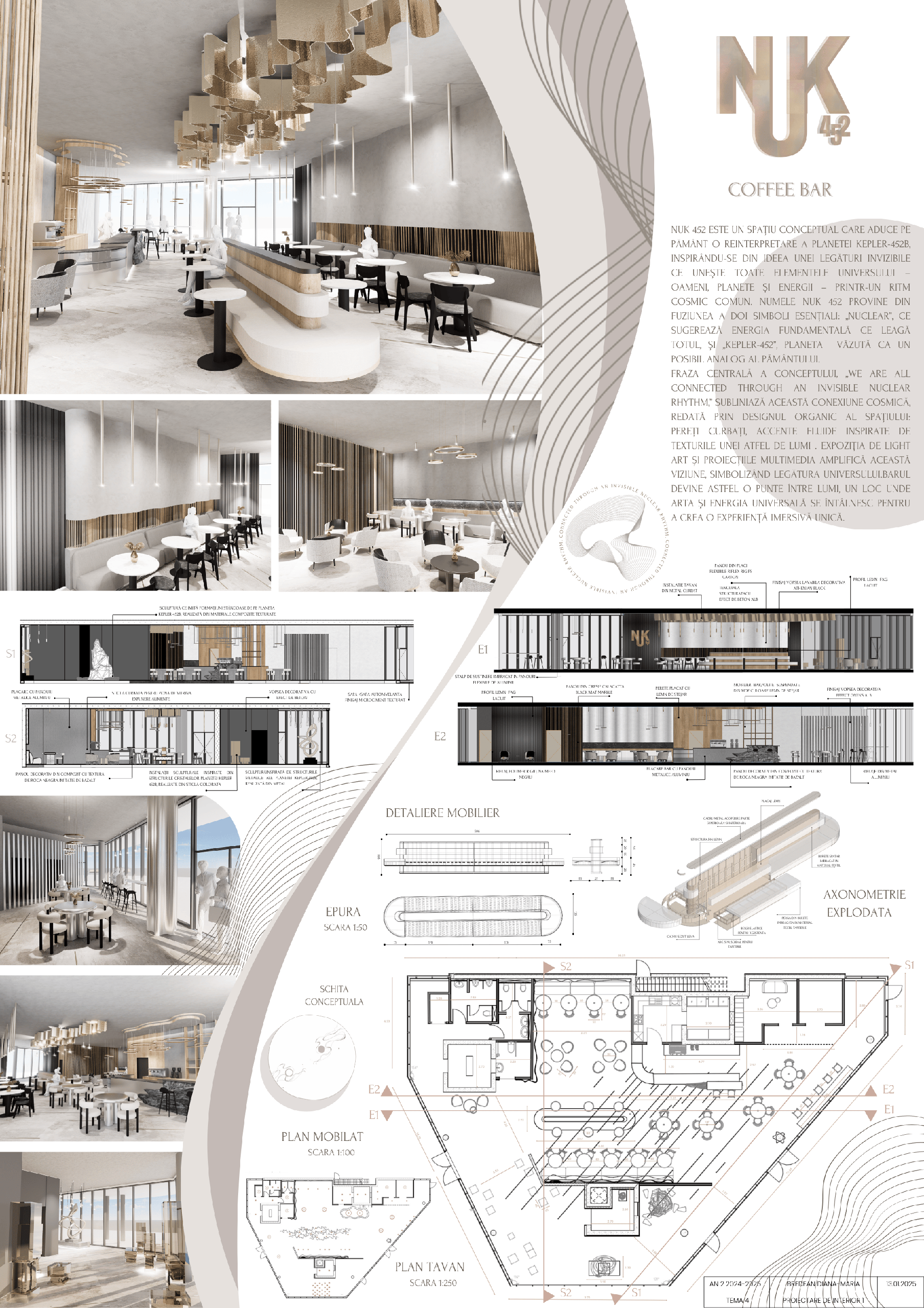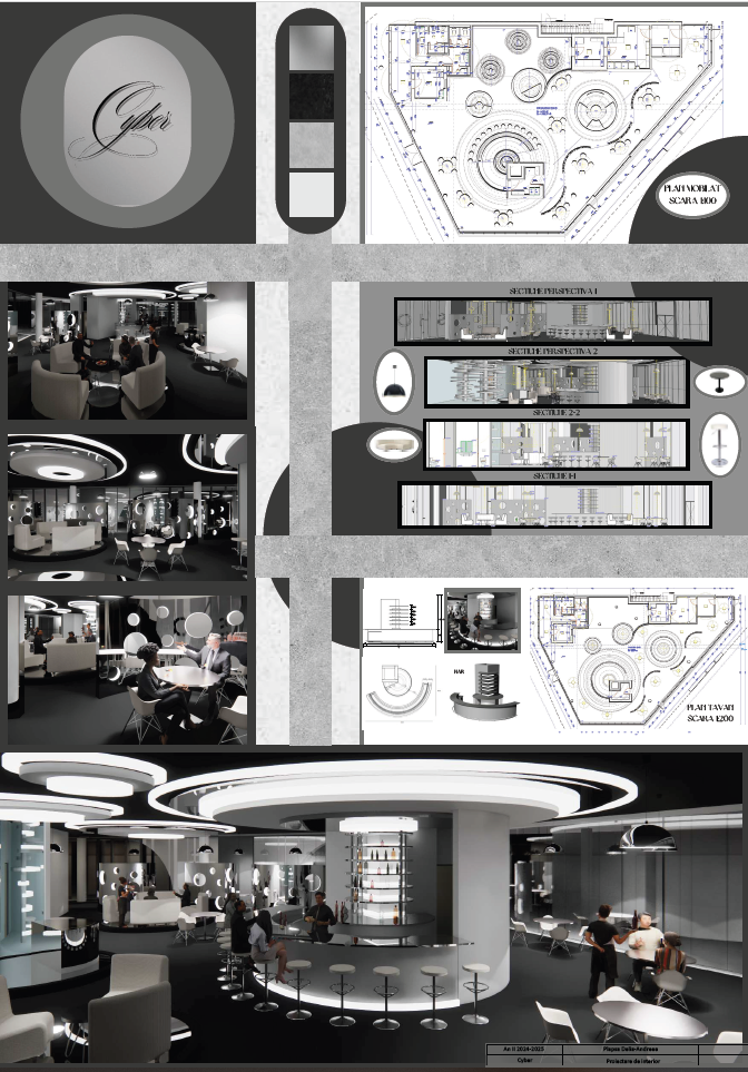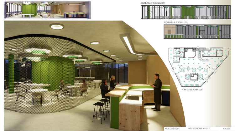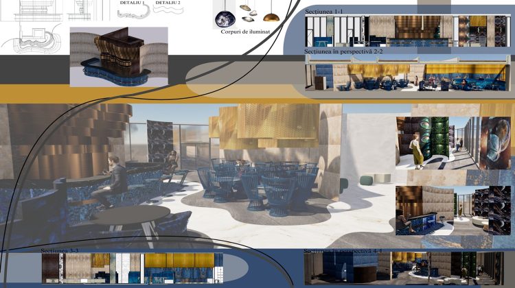 Interior Design Studio 1 (2nd year, Bachelor’s level) is a practice-based course aimed at strengthening interior design skills. The semester project involves transforming a pavilion within the ISHO Timișoara complex into a community space with a bar and interactive zone, inspired by cosmic imagination and futuristic exploration.