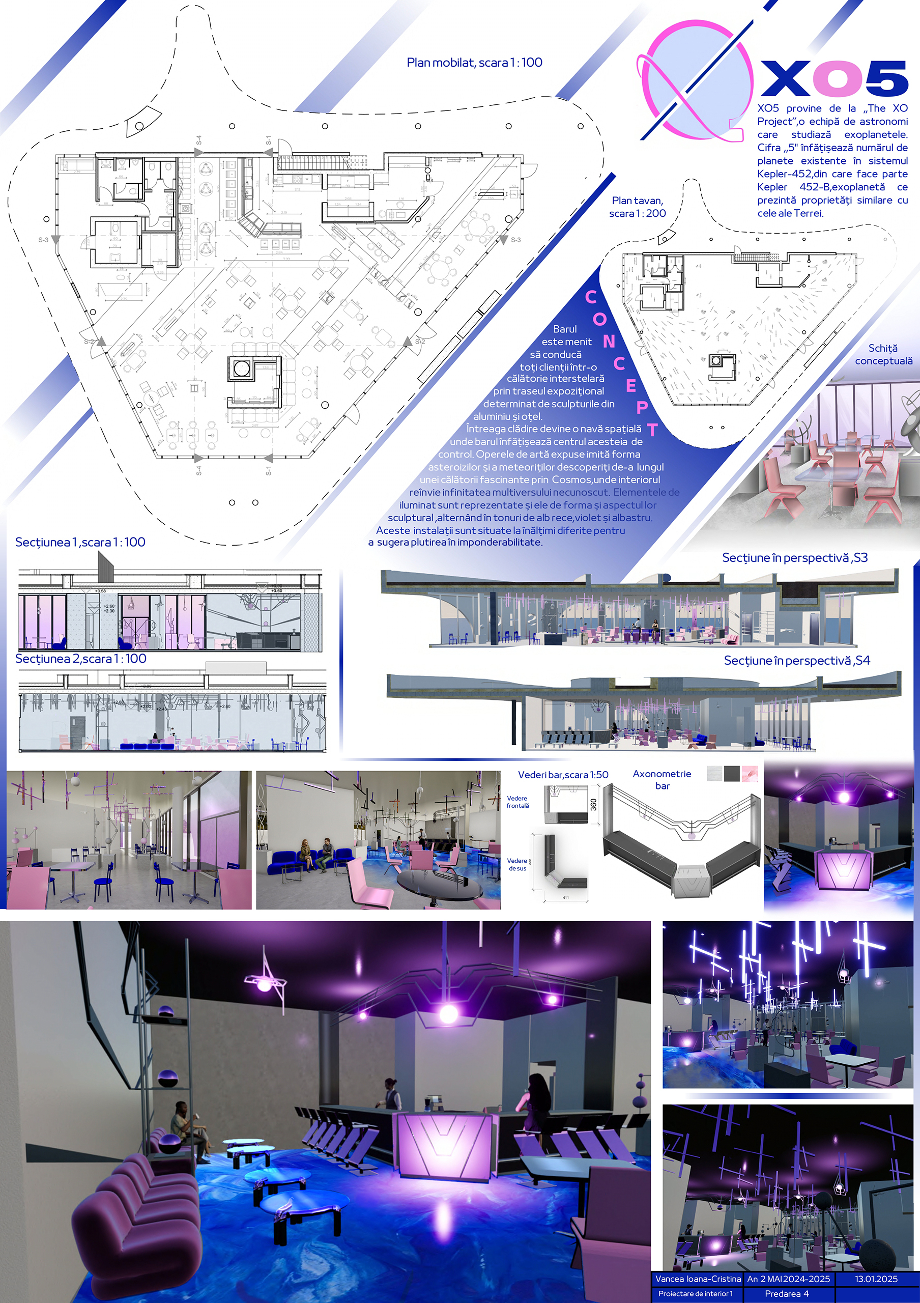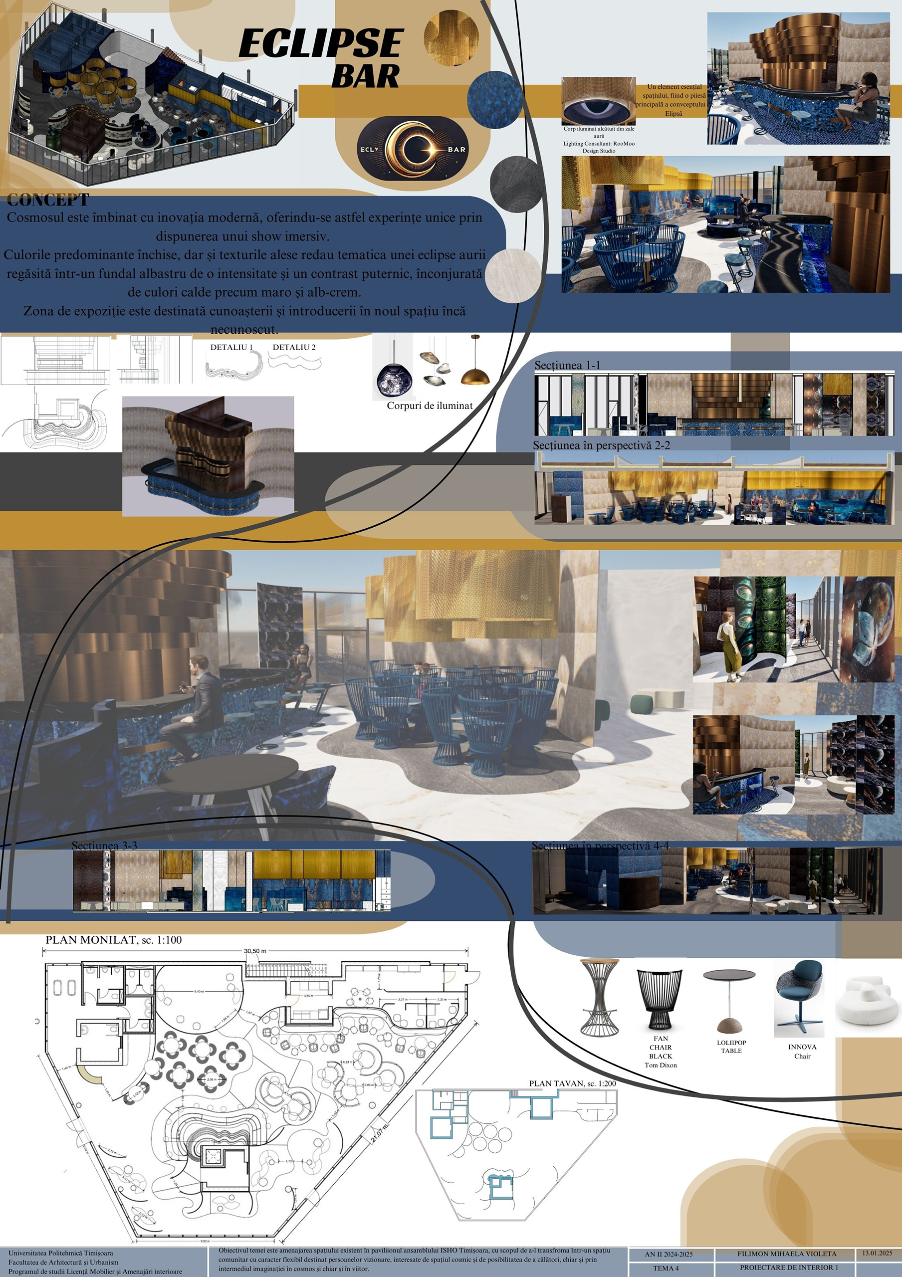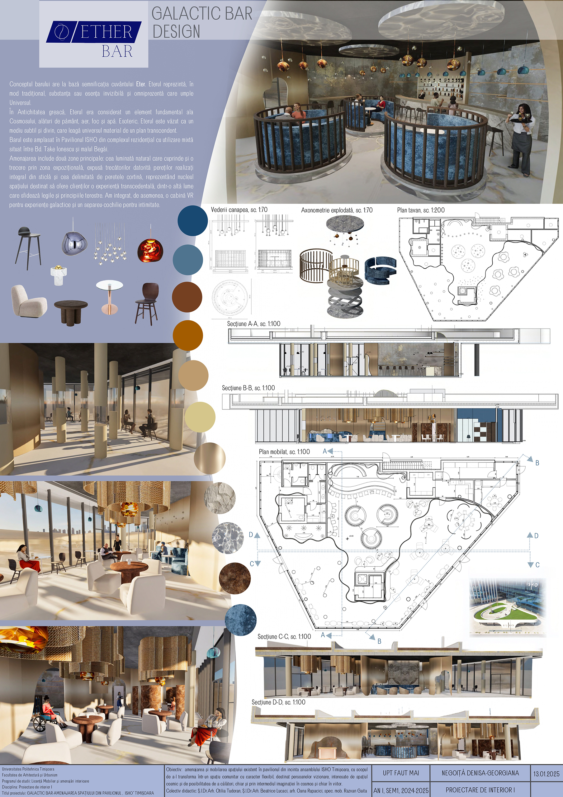 Proiectare de interior 1 (anul II, licență) este un curs aplicat ce urmărește consolidarea abilităților de a realiza o amenajare interioară. Tema semestrială vizează transformarea unui pavilion din ansamblul ISHO Timișoara într-un spațiu comunitar cu bar și zonă interactivă, inspirată de imaginarul cosmic.