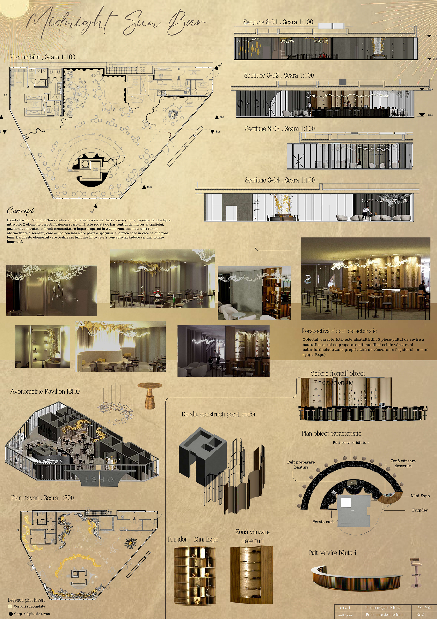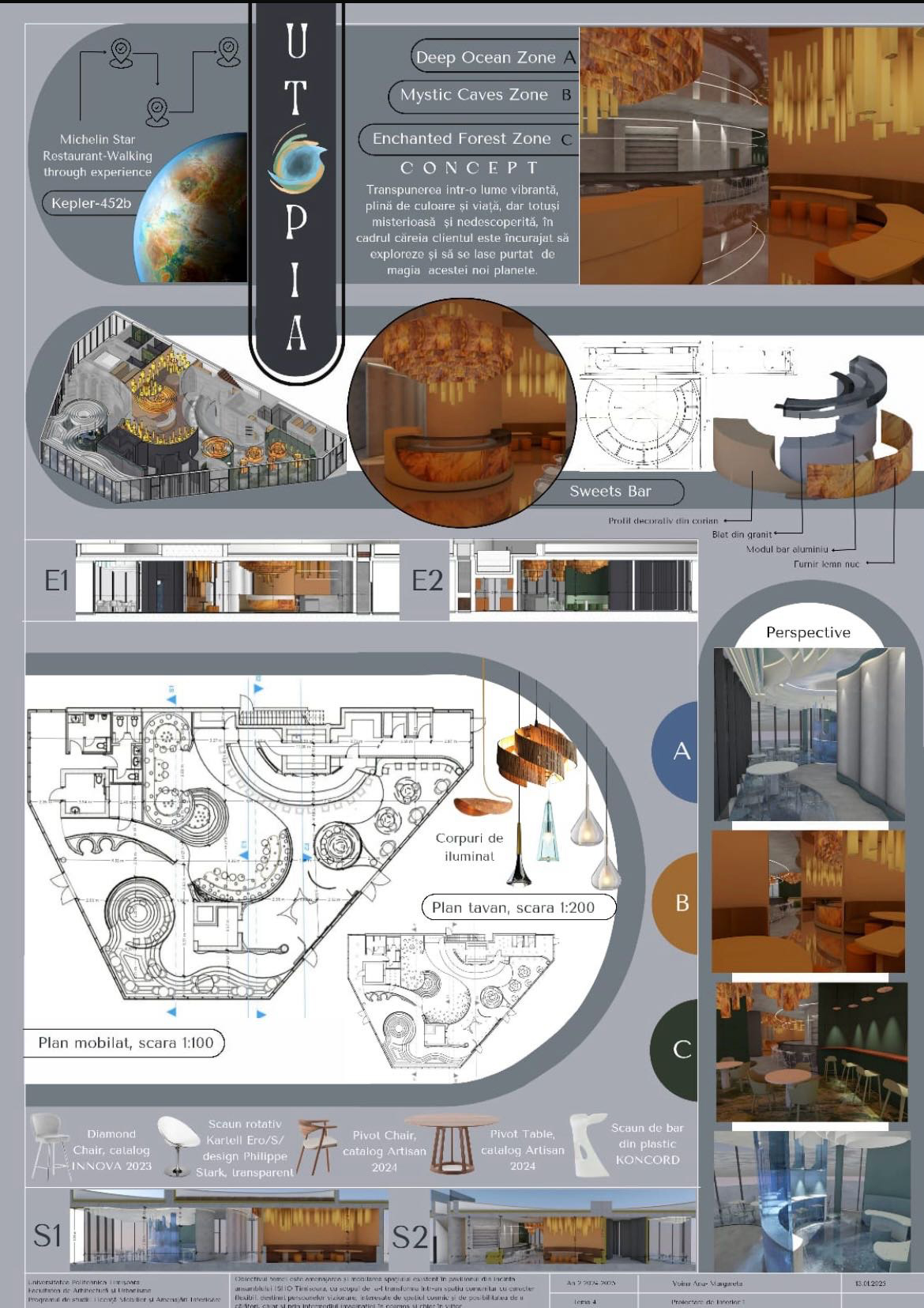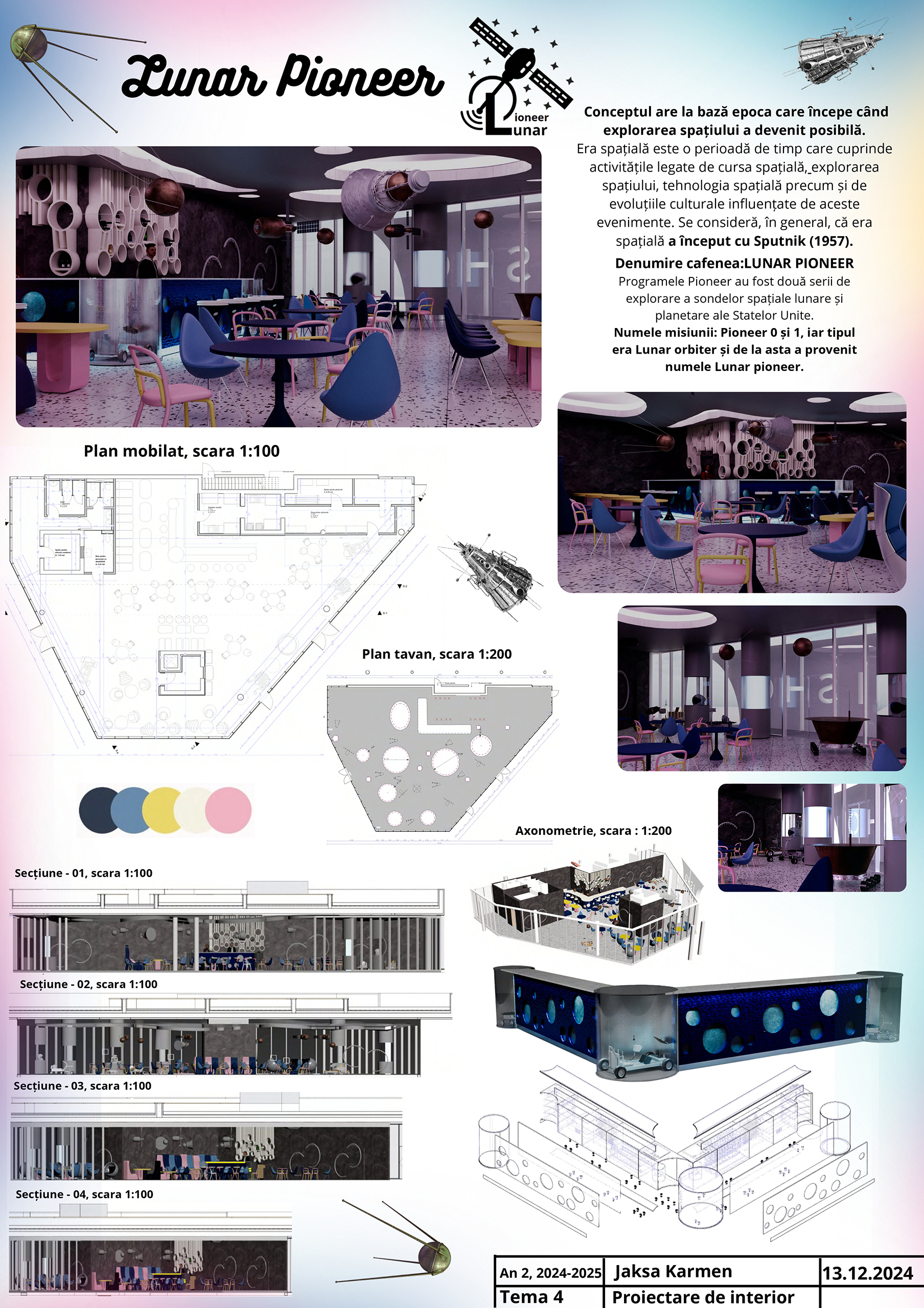 Proiectare de interior 1 (anul II, licență) este un curs aplicat ce urmărește consolidarea abilităților de a realiza o amenajare interioară. Tema semestrială vizează transformarea unui pavilion din ansamblul ISHO Timișoara într-un spațiu comunitar cu bar și zonă interactivă, inspirată de imaginarul cosmic.