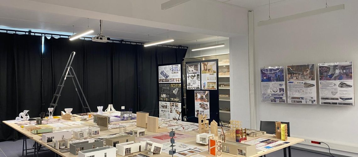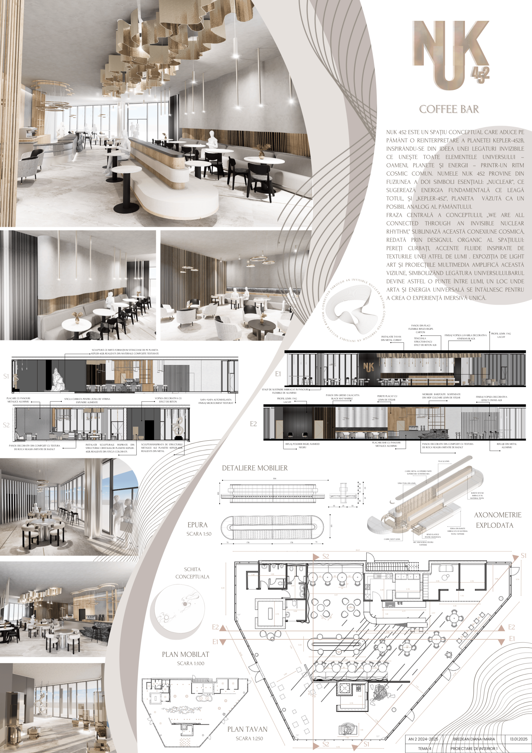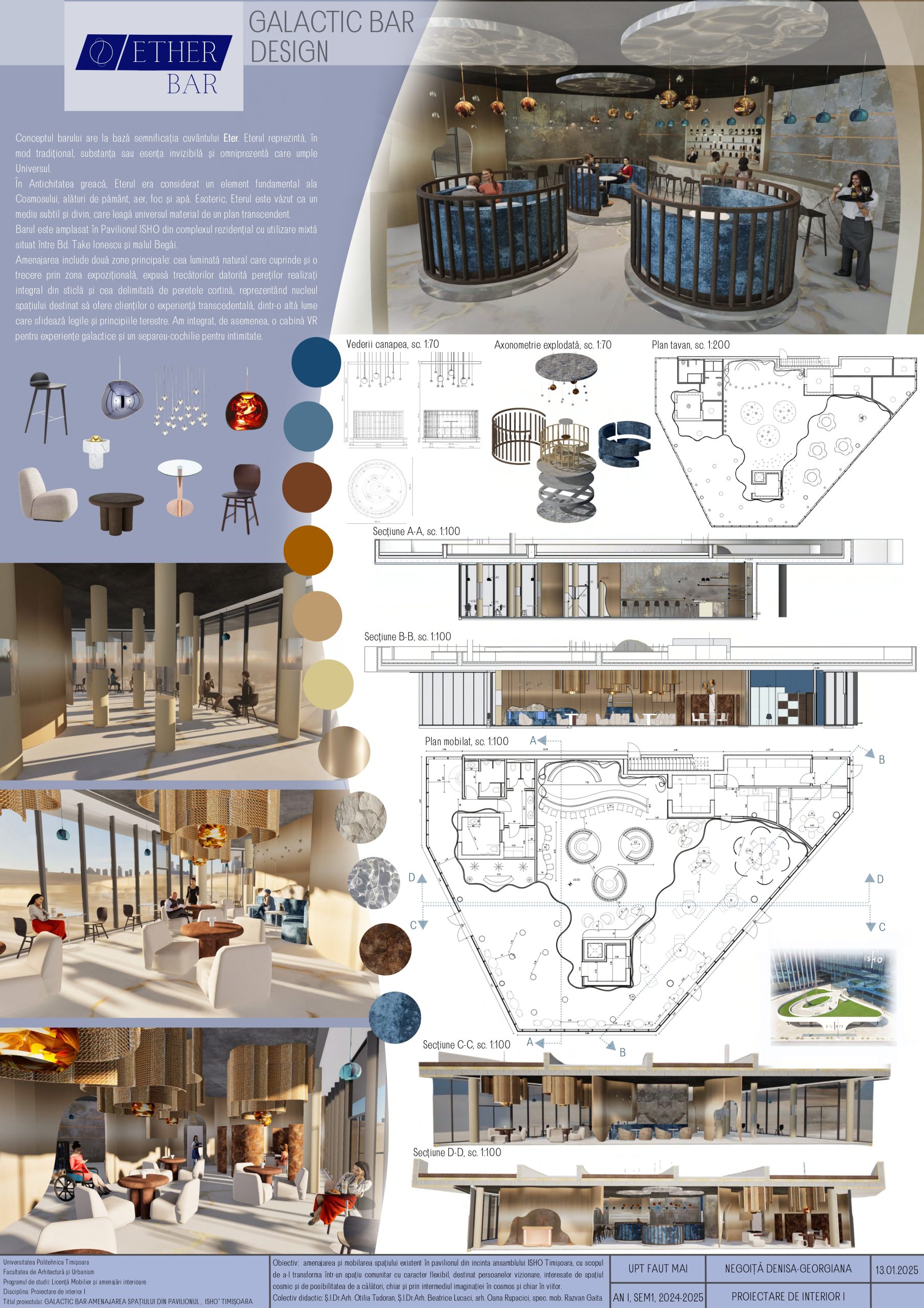 Interior Design Studio 2 (2nd year, Bachelor’s level) is a practice-based course aimed at strengthening interior design skills. The semester project involves transforming a pavilion within the ISHO Timișoara complex into a community space with a bar and interactive zone, inspired by cosmic imagination and futuristic exploration.